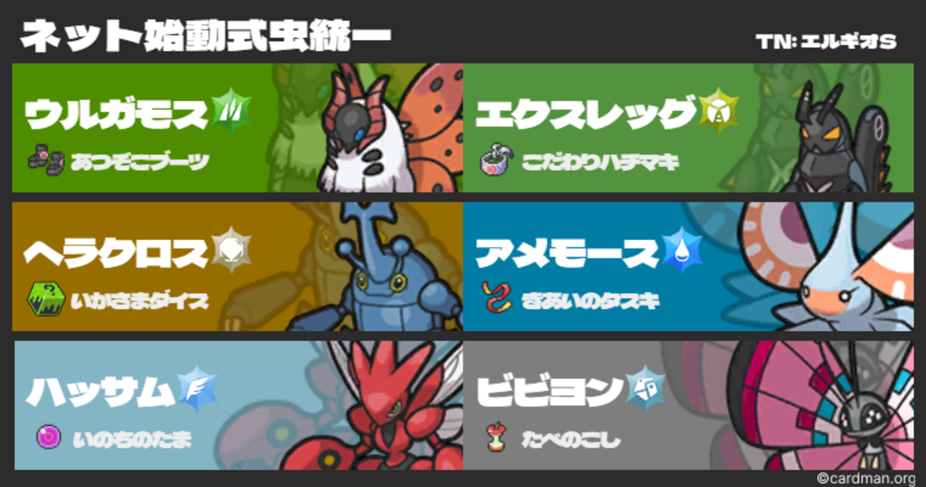 目次 はじめに コンセプト 個体紹介 ウルガモス エクスレッグ ヘラクロス アメモース ハッサム ビビヨン 課題点 クエスパトラ ヘイラッシャ さいごに はじめに はじめましての方ははじめまして。失格人間と申す者です。 みなさま、SVシーズン4お疲れさまでした。 今期は以前からたまに擦ってた虫統一で遊んでました。最終結...
